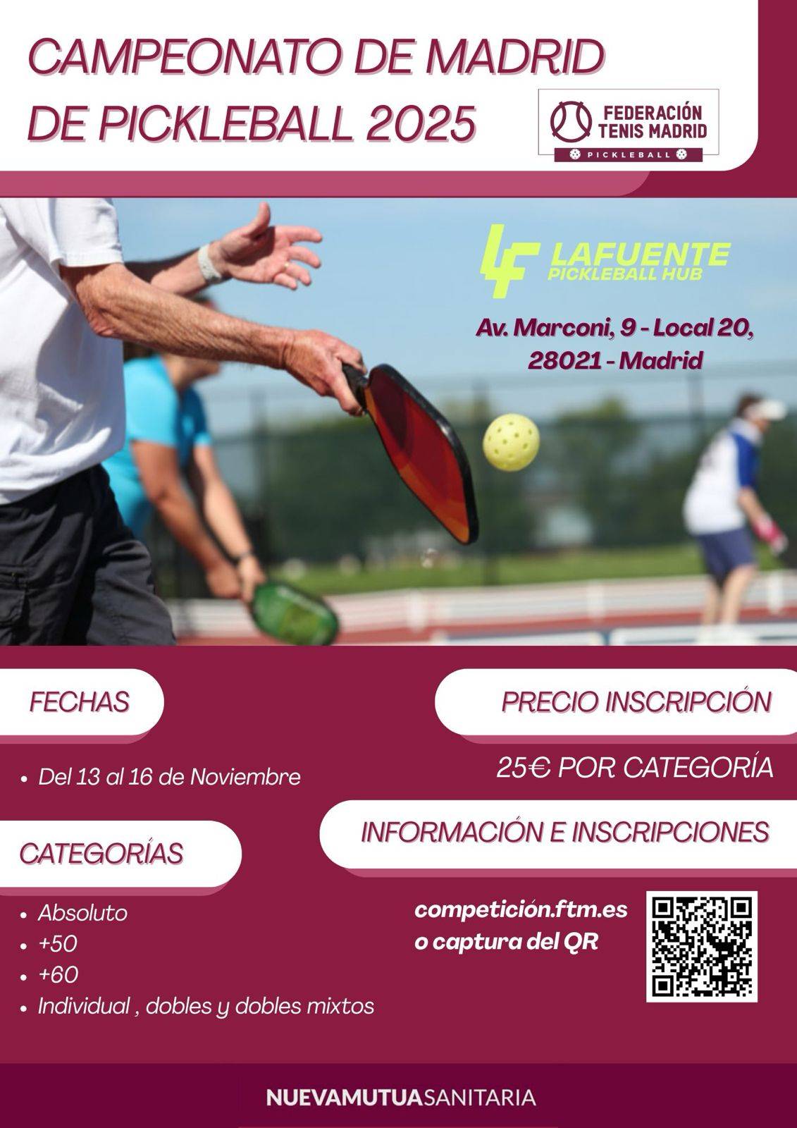 Del 13 al 16 de noviembre de 2025, el Lafuente Pickleball Hub se convertirá en el epicentro del mejor pickleball con la celebración del Campeonato de Madrid de Pickleball, un evento oficial organizado por la Federación de Tenis de Madrid.